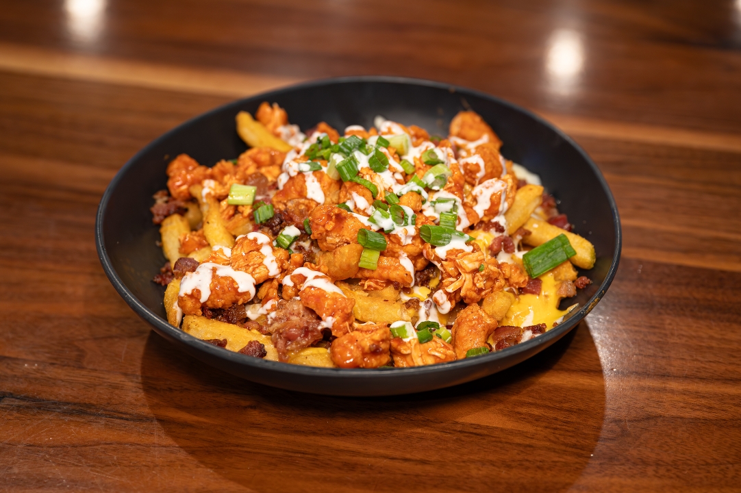 We fry diced potatoes golden brown, smother them in homemade ranch then top it off with bacon, melted cheddar and mozzarella cheese.