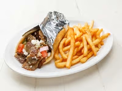 Bigger and Better! An overstuffed Pita with grilled lamb and beef layered with tzatziki sauce, lettuce, tomato, diced red onion, and feta cheese.
