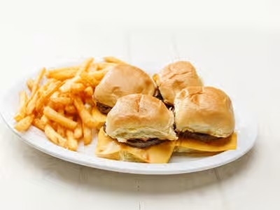 Three freshly made mini cheeseburgers, topped with sauteed onions and creamy garlic mayonnaise.