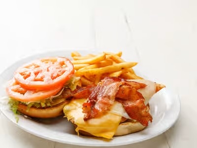 Marinated grilled chicken breast topped with yellow American cheese, Provolone cheese, sliced bacon and Honey Mustard dressing. Served on a Brioche bun with lettuce and tomato.