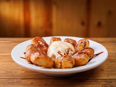 10 Pretzel bites fried to a golden brown. Served with Ice cream, chocolate syrup, caramel and dusted with powdered sugar. For the Win!